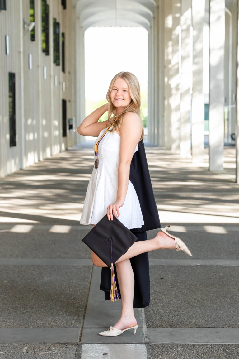 I love bringing seniors here when they want something elegant and traditional. The vibe is powerful yet simple, making it ideal for graduation photos that feel polished and professional.